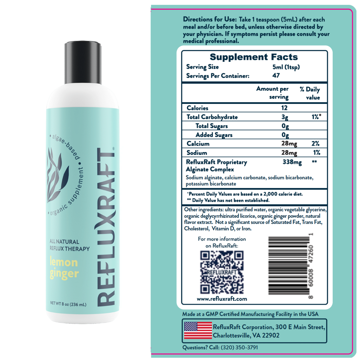 Take 1-2 teaspoons (5-10 mL) of RefluxRaft as needed following meals and/or before bed.